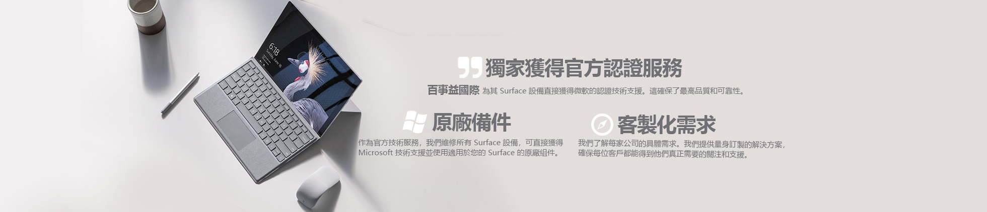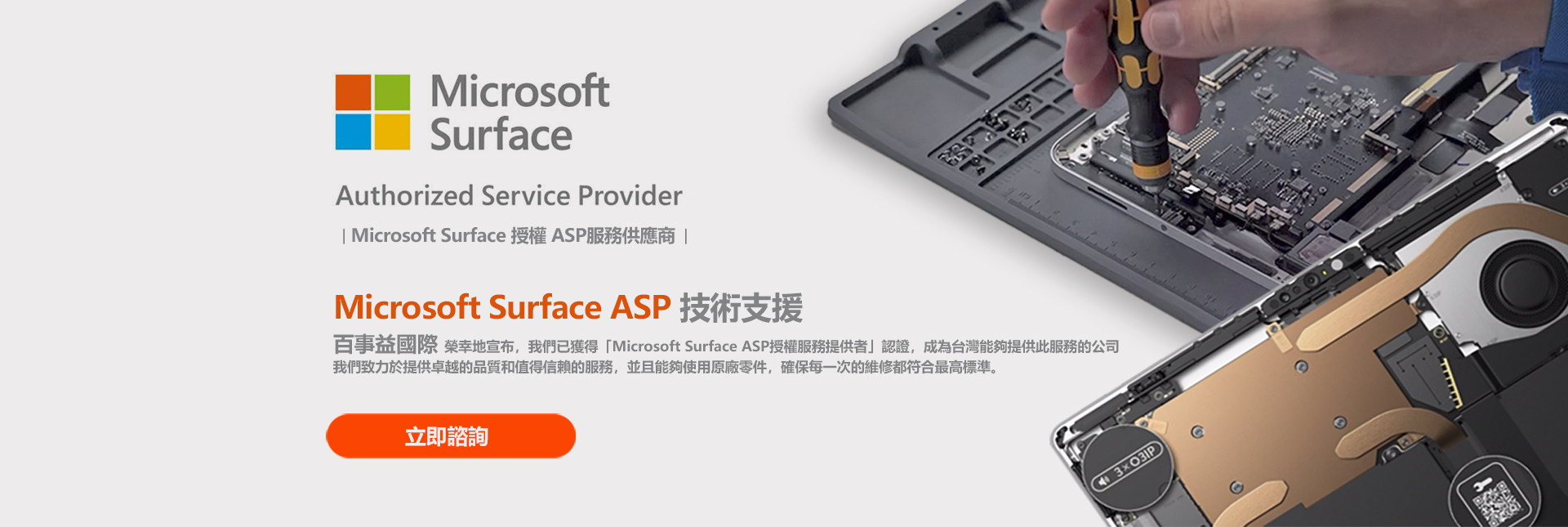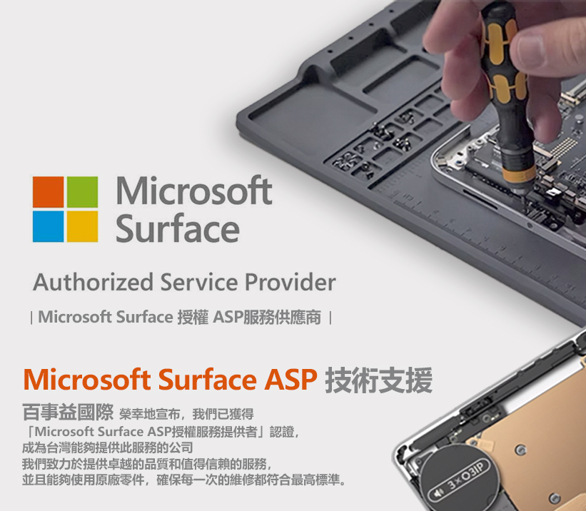 百事益國際榮獲 Microsoft 官方 ASP 授權,可執行包含 Surface 系列、筆電、周邊設備等多品項的原廠維修任務,